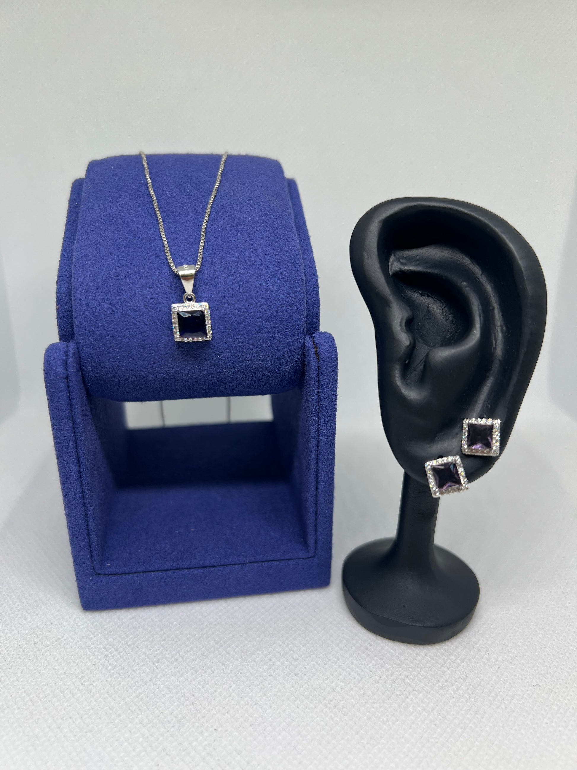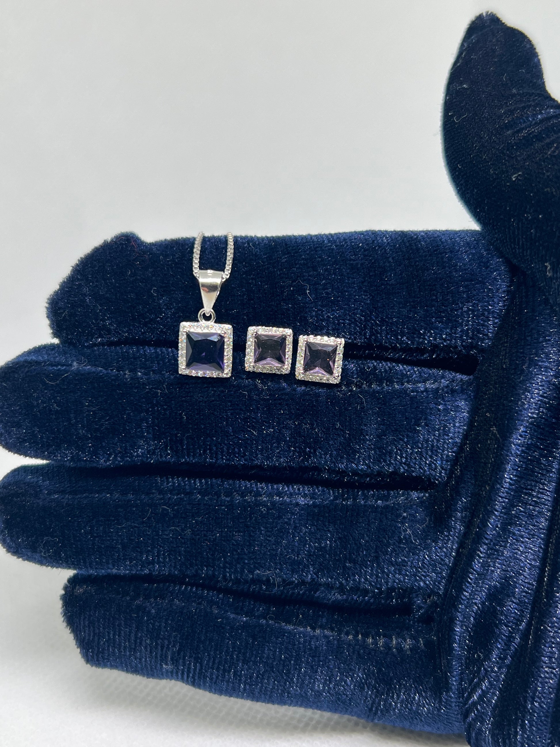 Sterling Silver Purple Diamond Radiant Earring and Pendant Set